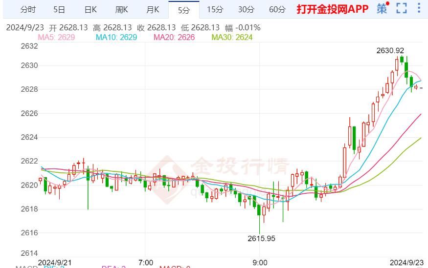 周一(9月23日)本交易日国际金价日内维持震荡走势 ,今日开盘报2621.36美元/盎司,最高触及2630.92美元/盎司,最低触及2615.95美元/盎司 ,截止发稿金价报2628.57美元/盎司,涨幅0.25%。